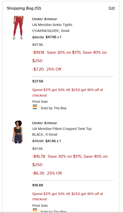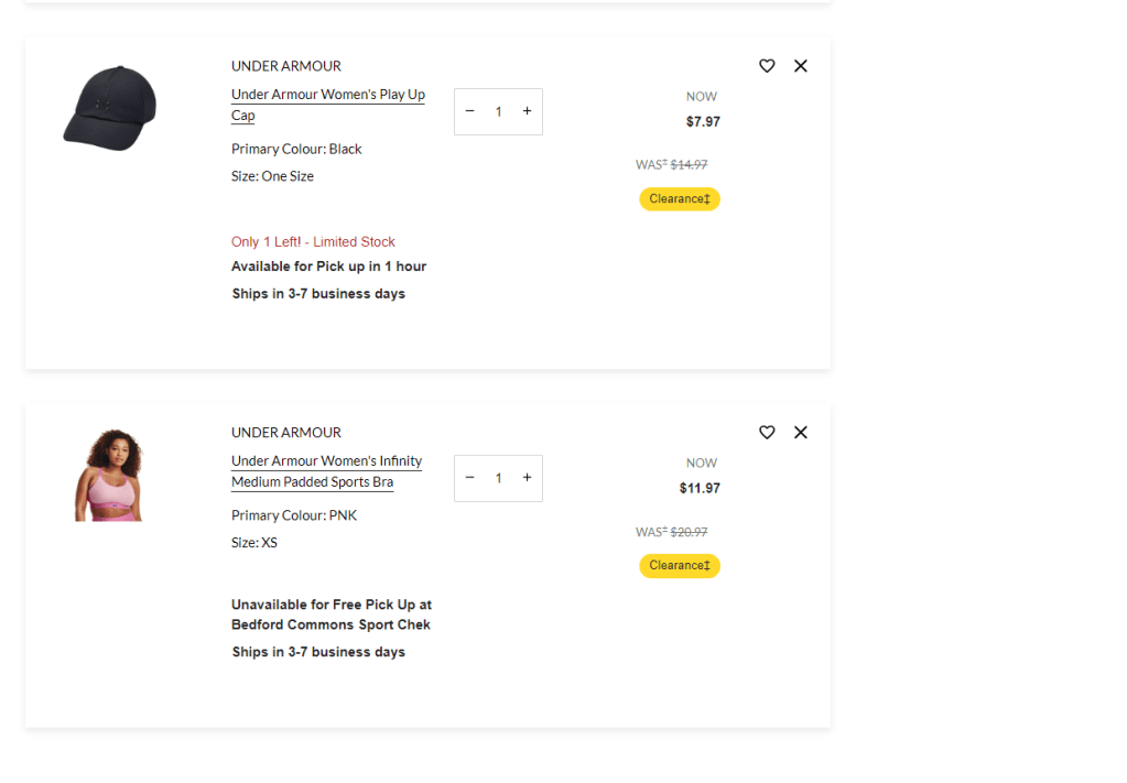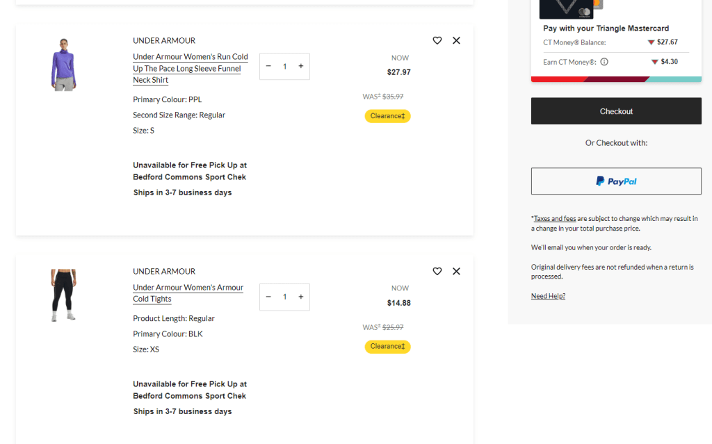 SportChek has a well-populated Clearance section with amazing deals. See below a cart I found for winter training gear; 7 Under Armour and Nike items for only $107!