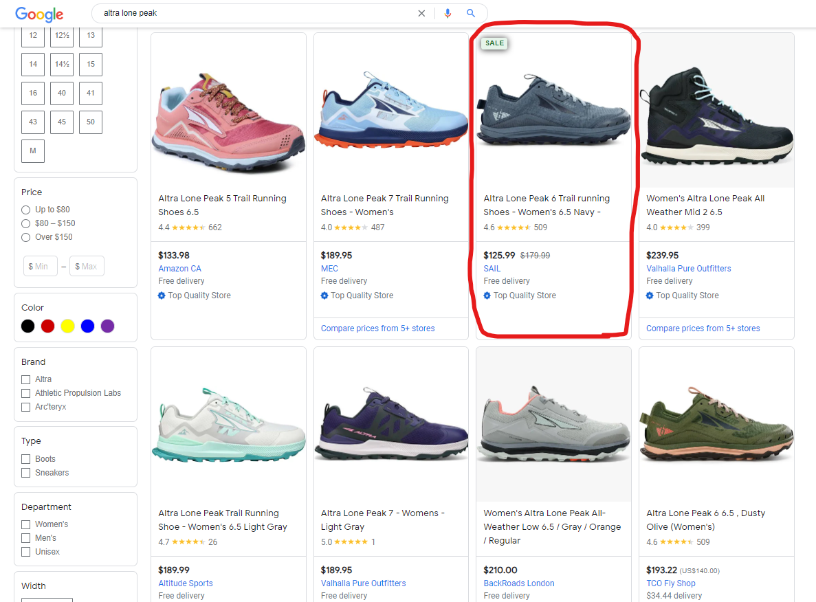 Before I buy anything, I search Google Shopping to see if there are any cheaper options available. A search for the Altra Lone Peak has identified a sale for the non-waterproof version for only $125.99. If I wasn’t so fussy, I could save even more money because the sale store also offers cashback via Rakuten!