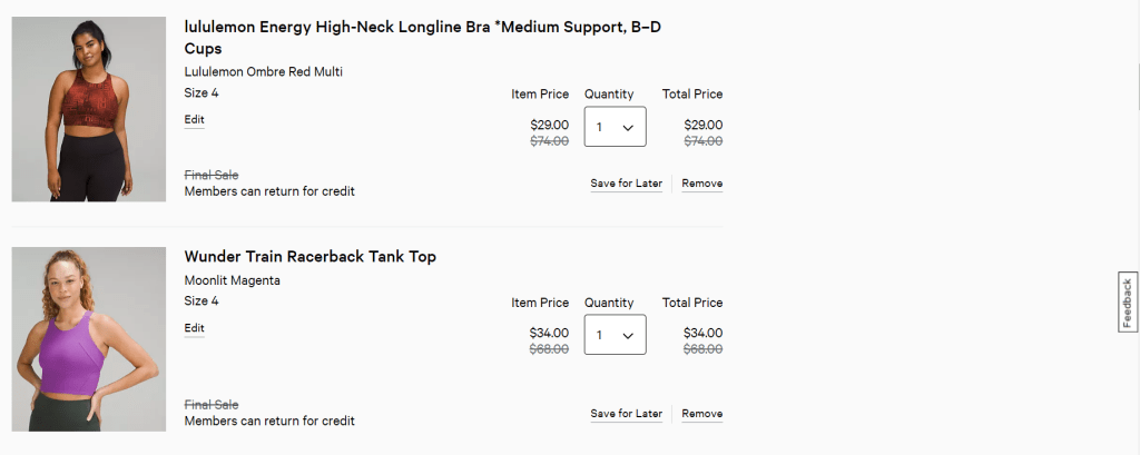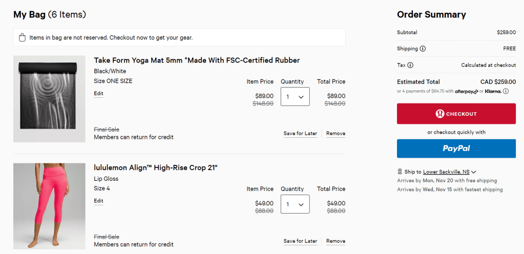 lululemon is always my top pick for athletic wear. I find it fits me better than any other brand. While I sometimes treat myself to New Arrivals, I do a lot of shopping in the We Made Too Much Section. Especially around the change in season, or Black Friday, when they release a lot of gear that has been saved for the occasion.
