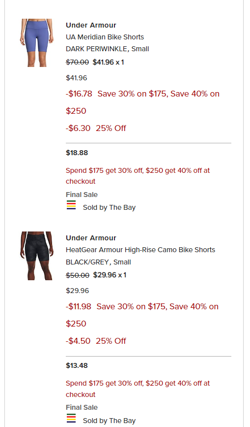 On the date I wrote this article, I was able to find $448.60 in Under Armour and Nike gear for only $182.53, taxes in, with the current Buy More, Get More sale and my HBC reward points!